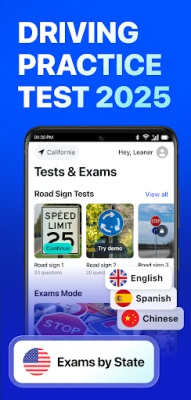 DMV Permit Practice Test 2025 App prepares knowledge written tests for a driver's license including Cars, Commercial Vehicles and Motorcycles. Well-designed learning courses and updated DMV permit practice tests are available for drivers.